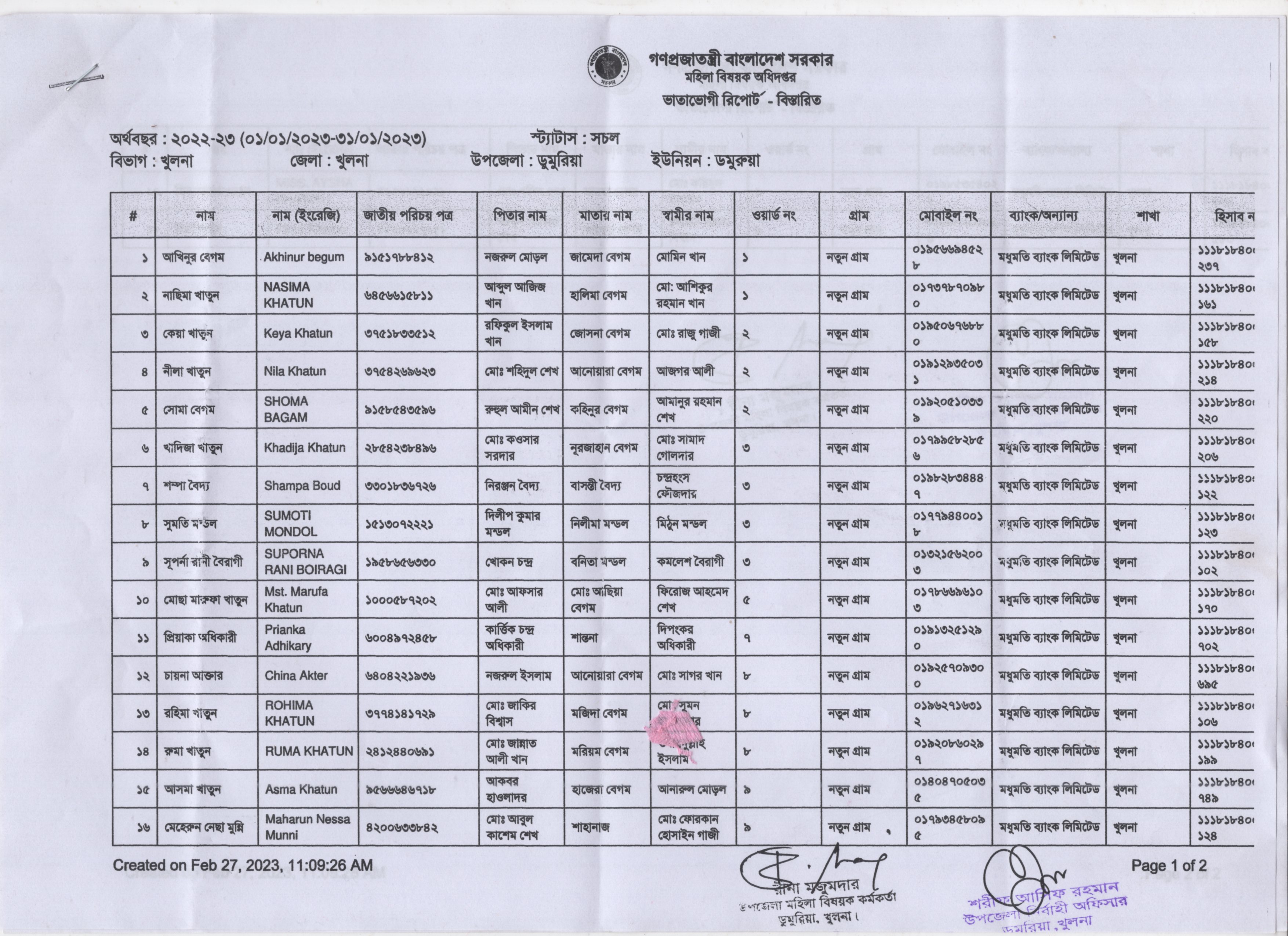 | 16. | হাসিনা বেগম | স্বামী-আব্দুর রহিম মোড়ল | ডুমুরিয়া | ০৯ |