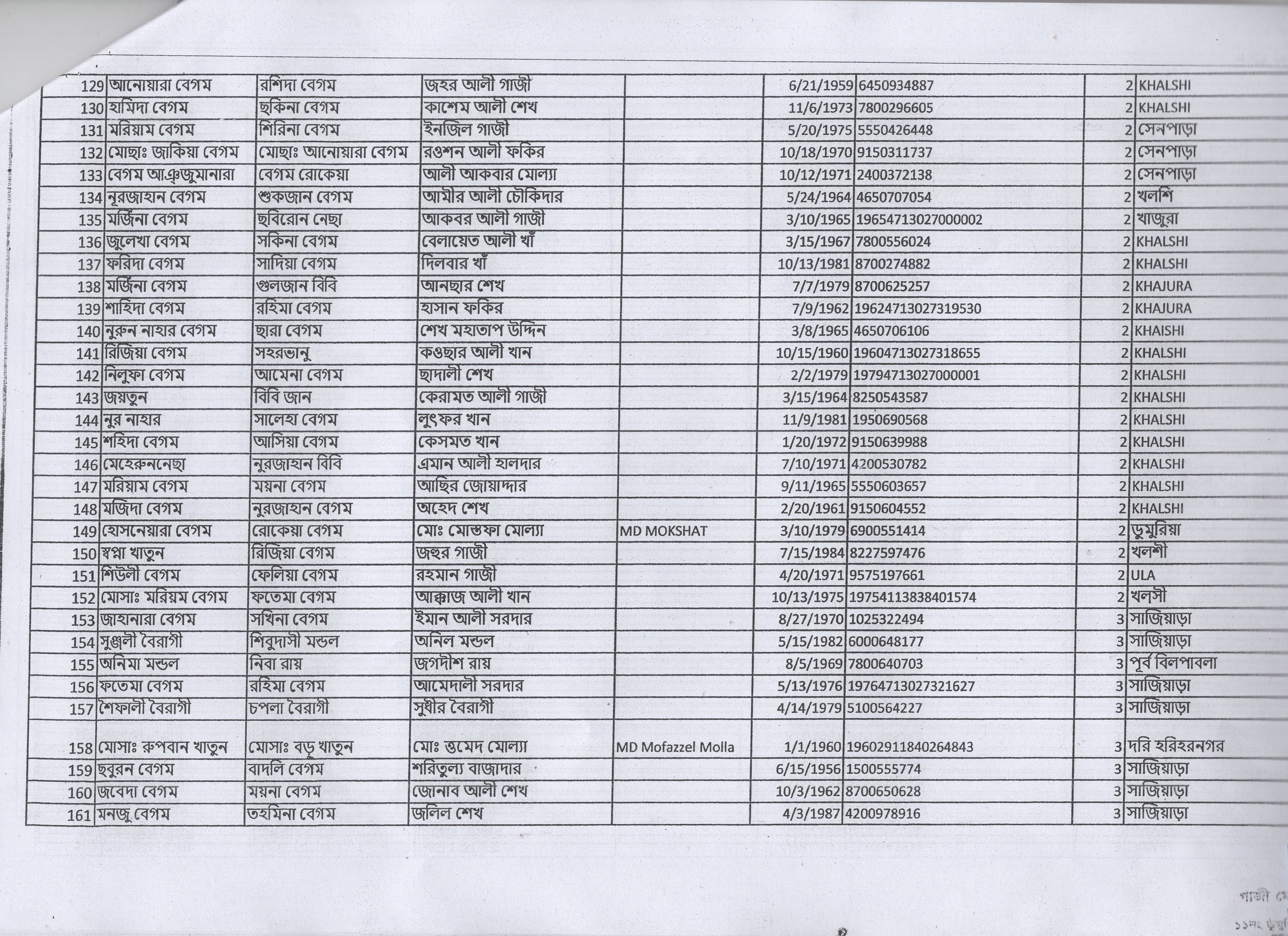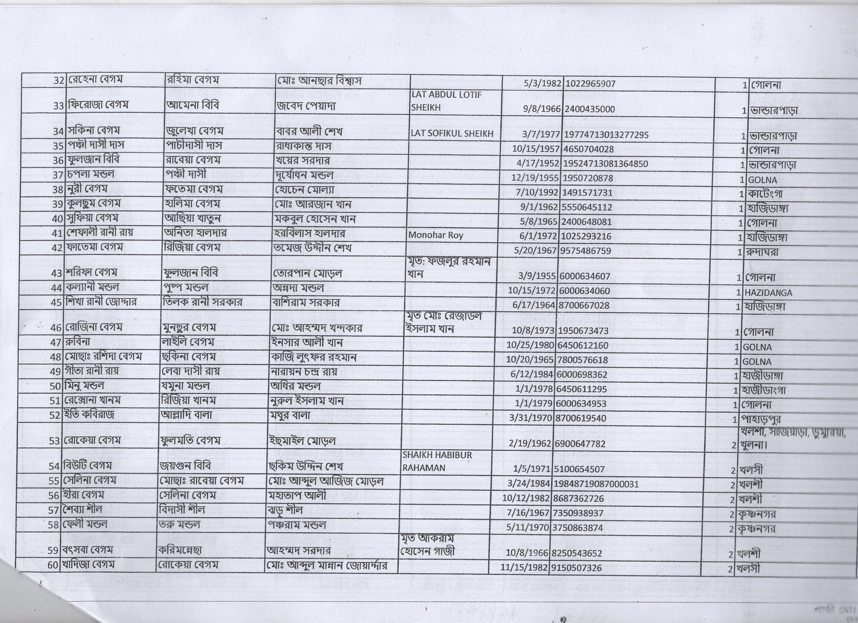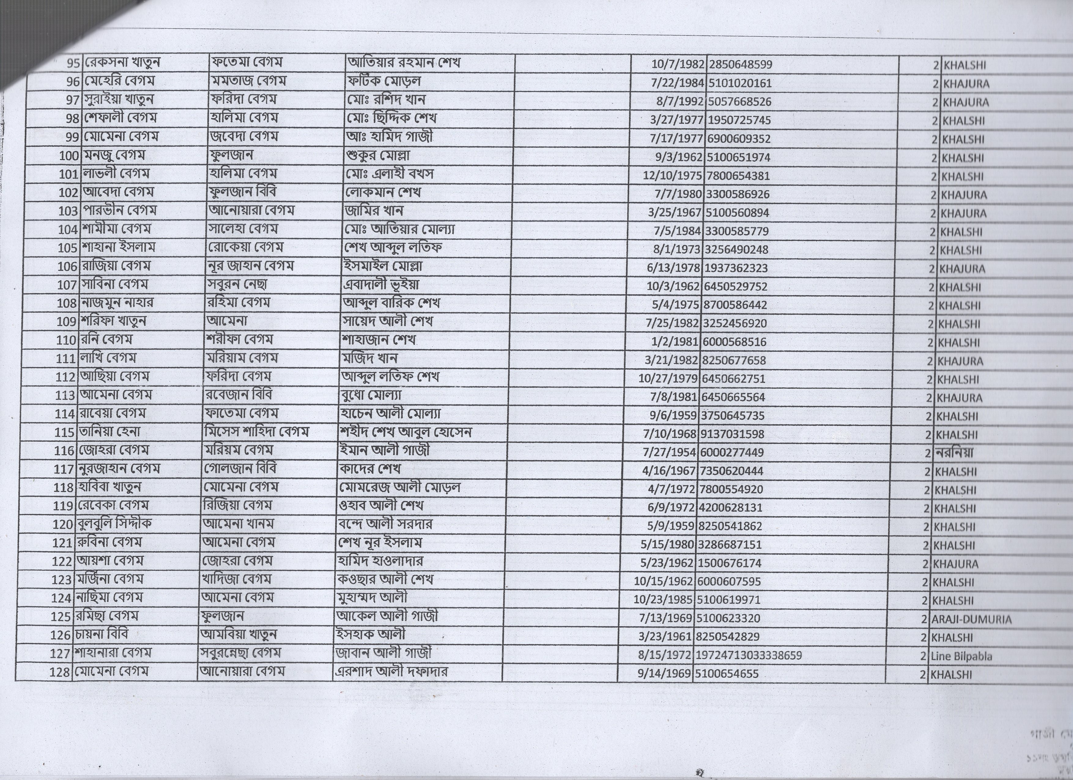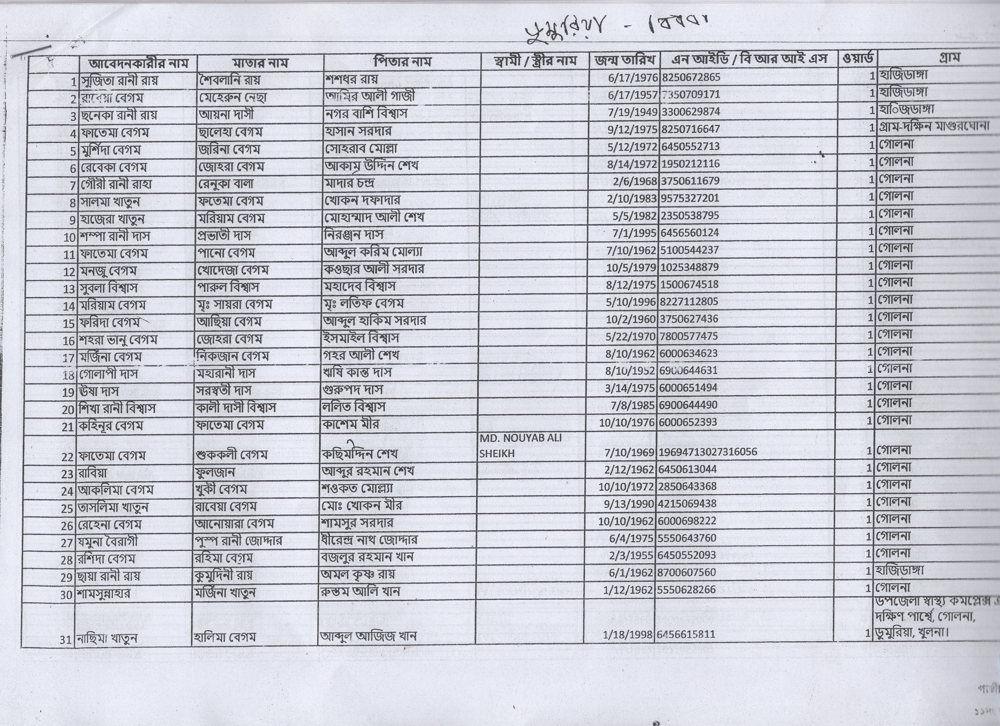 | 1. | মেহেরুননেছা | মৃত শাহাদাত শেখ | খলশী | ২ | ১২২৮ | ১৬৫১৩ |