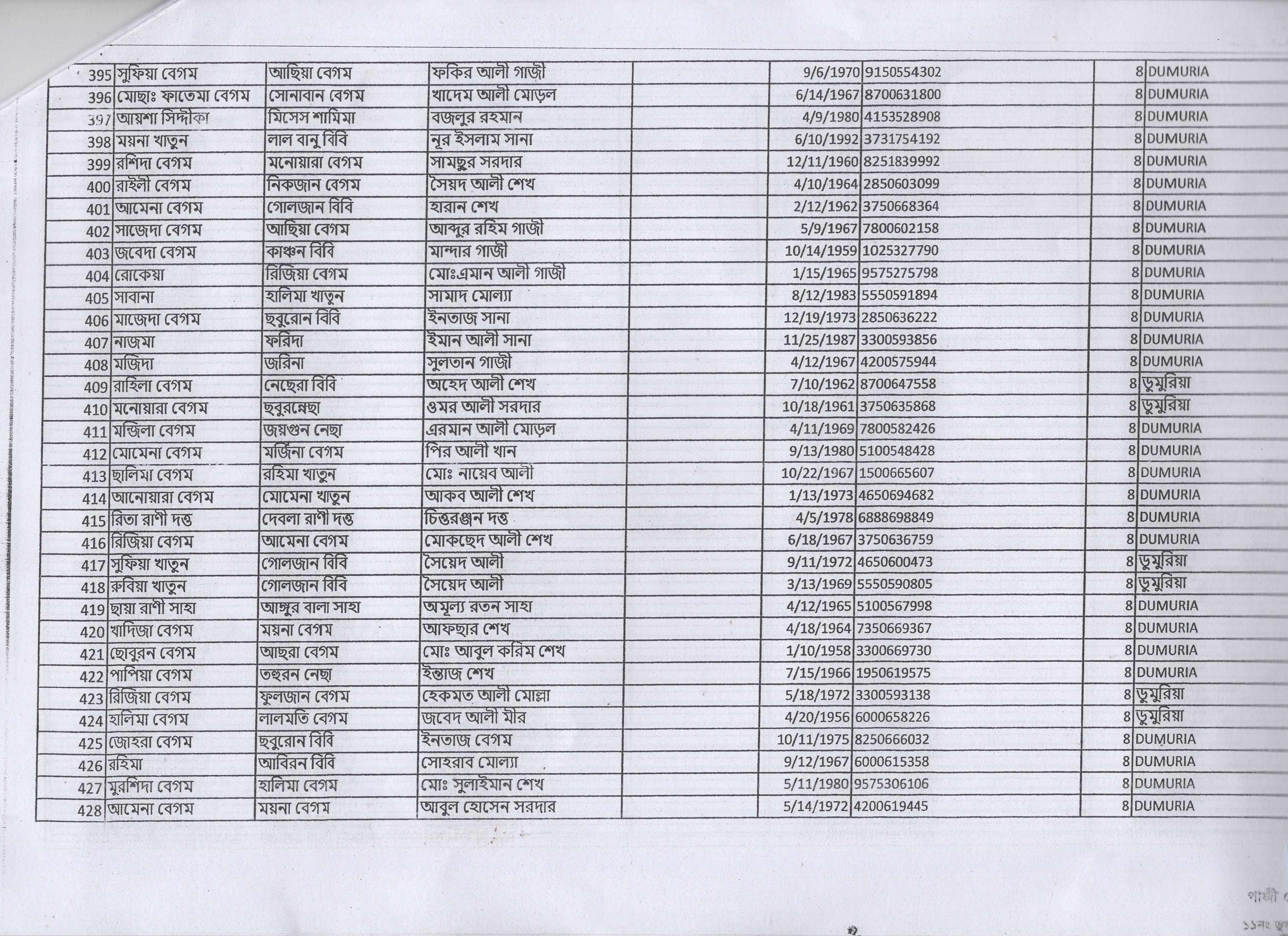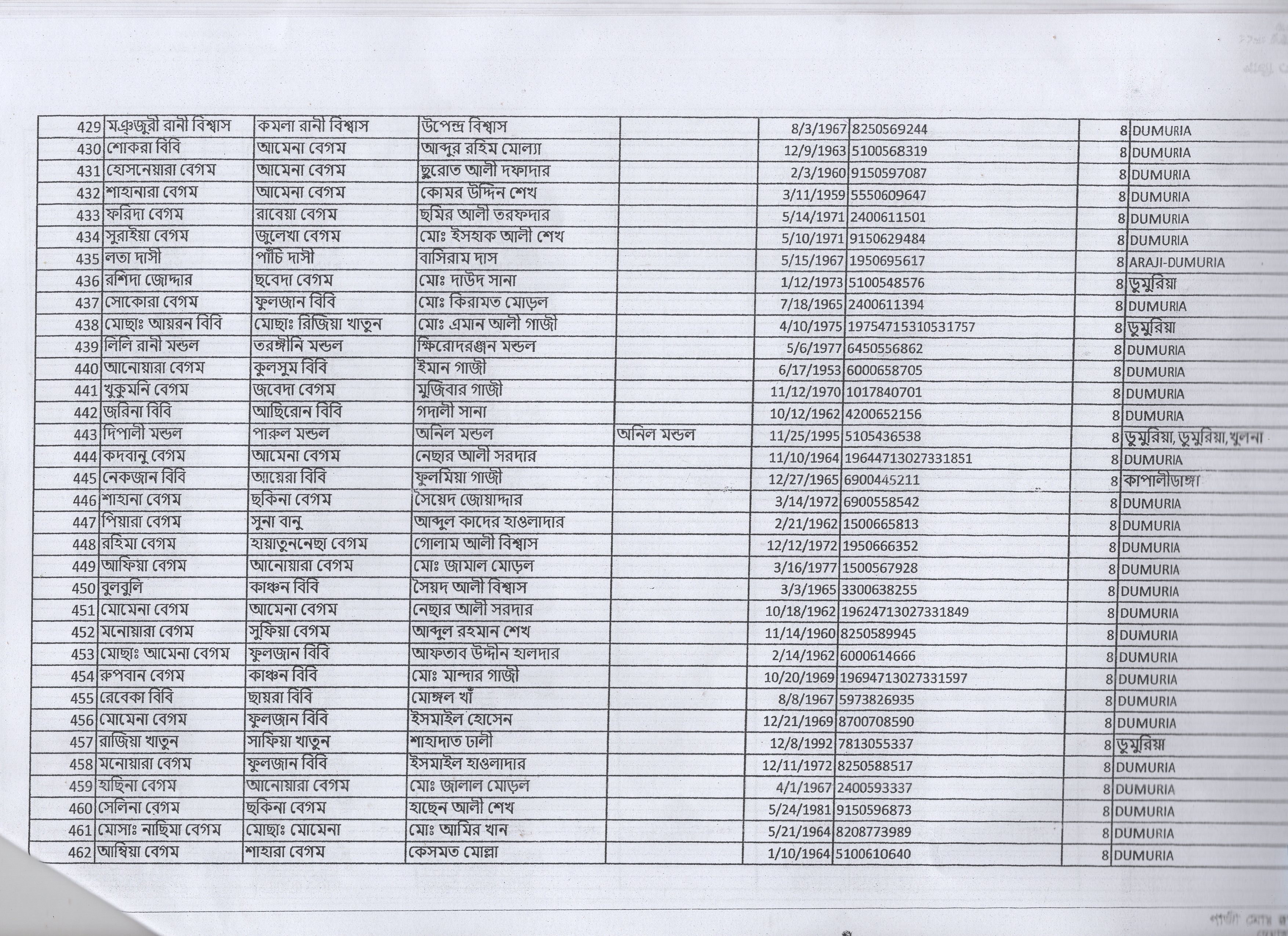 | 23. | বুলবুলি বেগম | মৃত গফুর বিশ্বাস | ডুমুরিয়া | ৮ | ২৯০০ | ১৬১৪৩ |