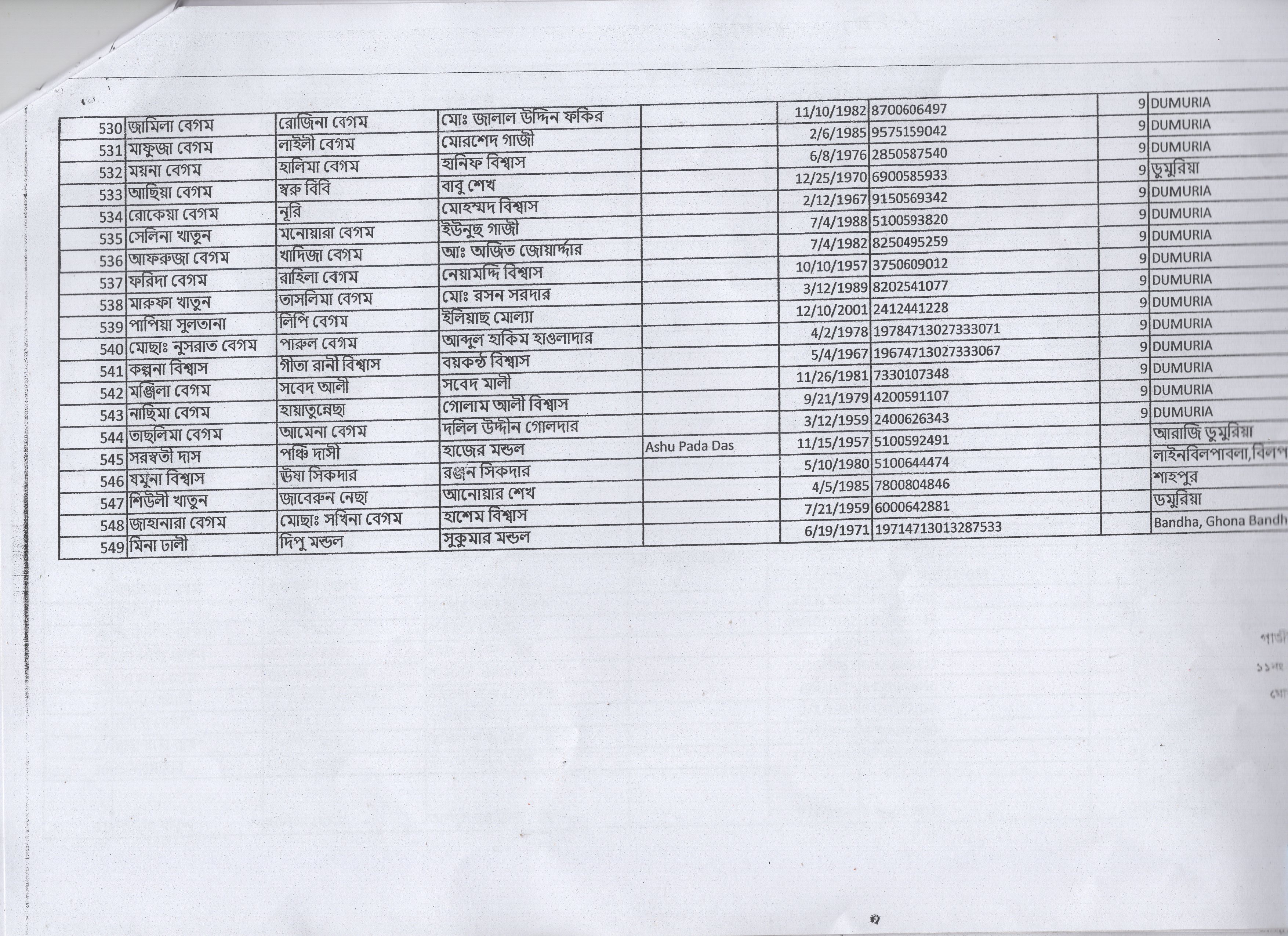 | 22. | আন্না দাসী | মৃত ধীরেন বিশ্বাস | আ: ডুমুরিয়া | ৬ | ১৫৯২ | ১৬৫৫৯ |