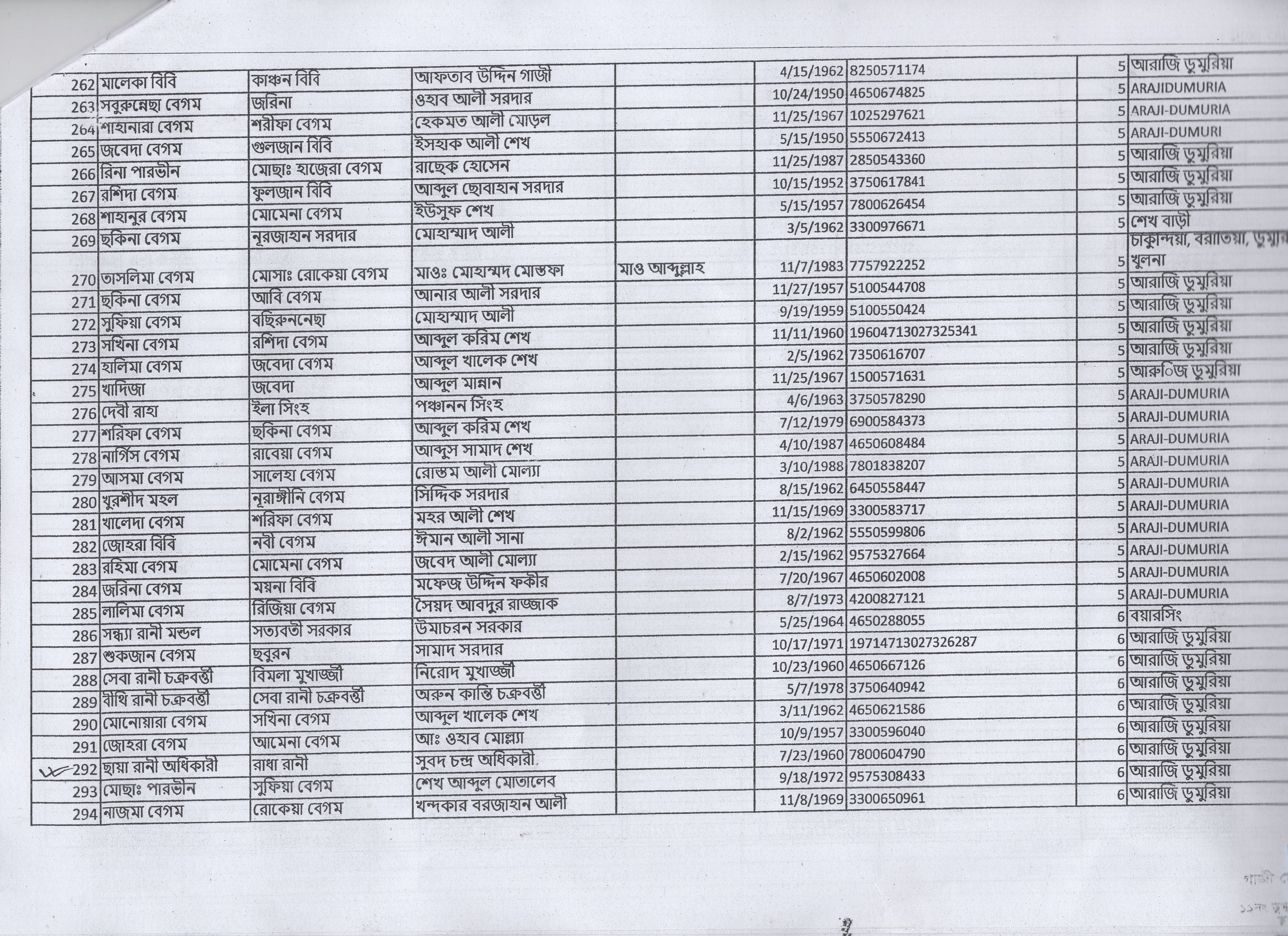 | 3. | রহিমা বেগম | মৃত নজরুল ইসলাম | দ: ডুমুরিয়া | ৯ | ১২৫৯/১ | ১৫৮৬২ |