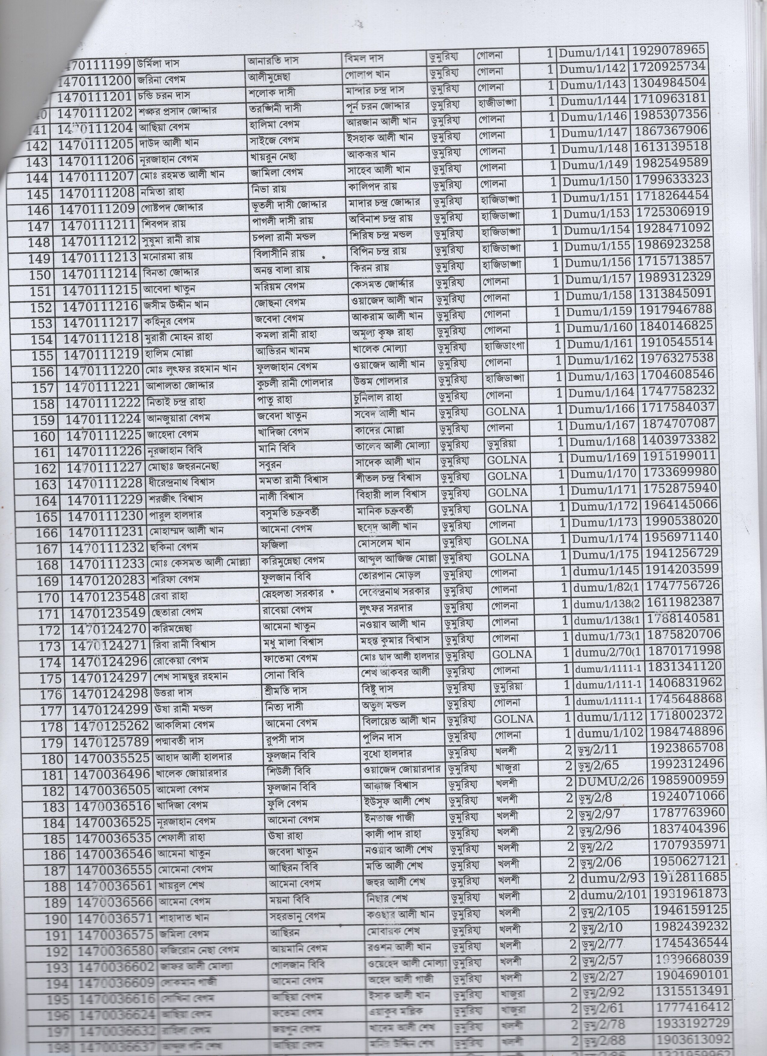 | 51. | অরুণা মন্ডল | মৃত রাধা কান্ত মন্ডল | গোলনা | ১ | ৯০২ | ০২২১০৯২৫৭ |
