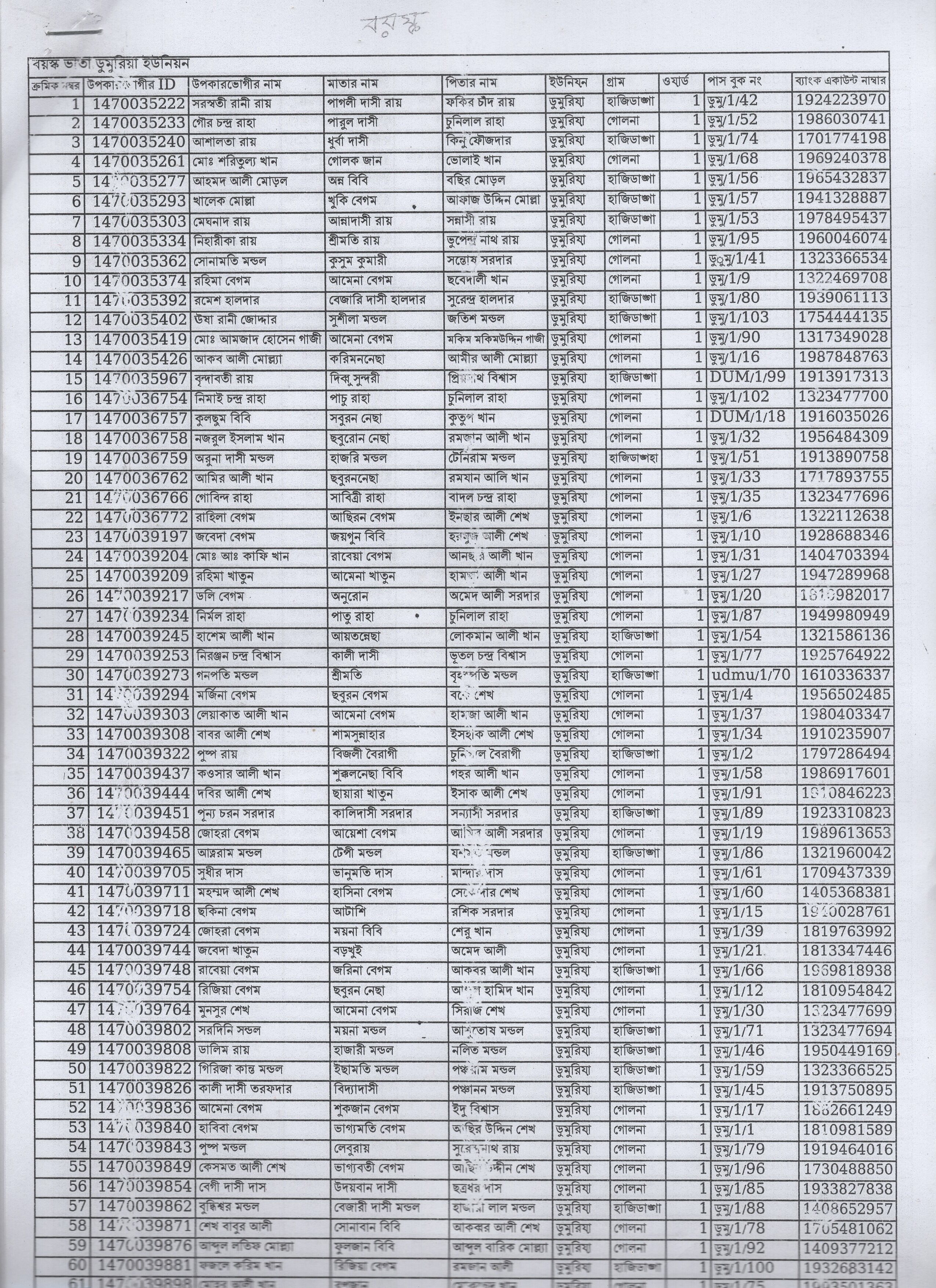 ১১নং ডুমুরিয়া ইউনিয়নের ২নং ওয়ার্ডের বয়ষ্ক ভাতাভোগীদের নামের তালিকা: