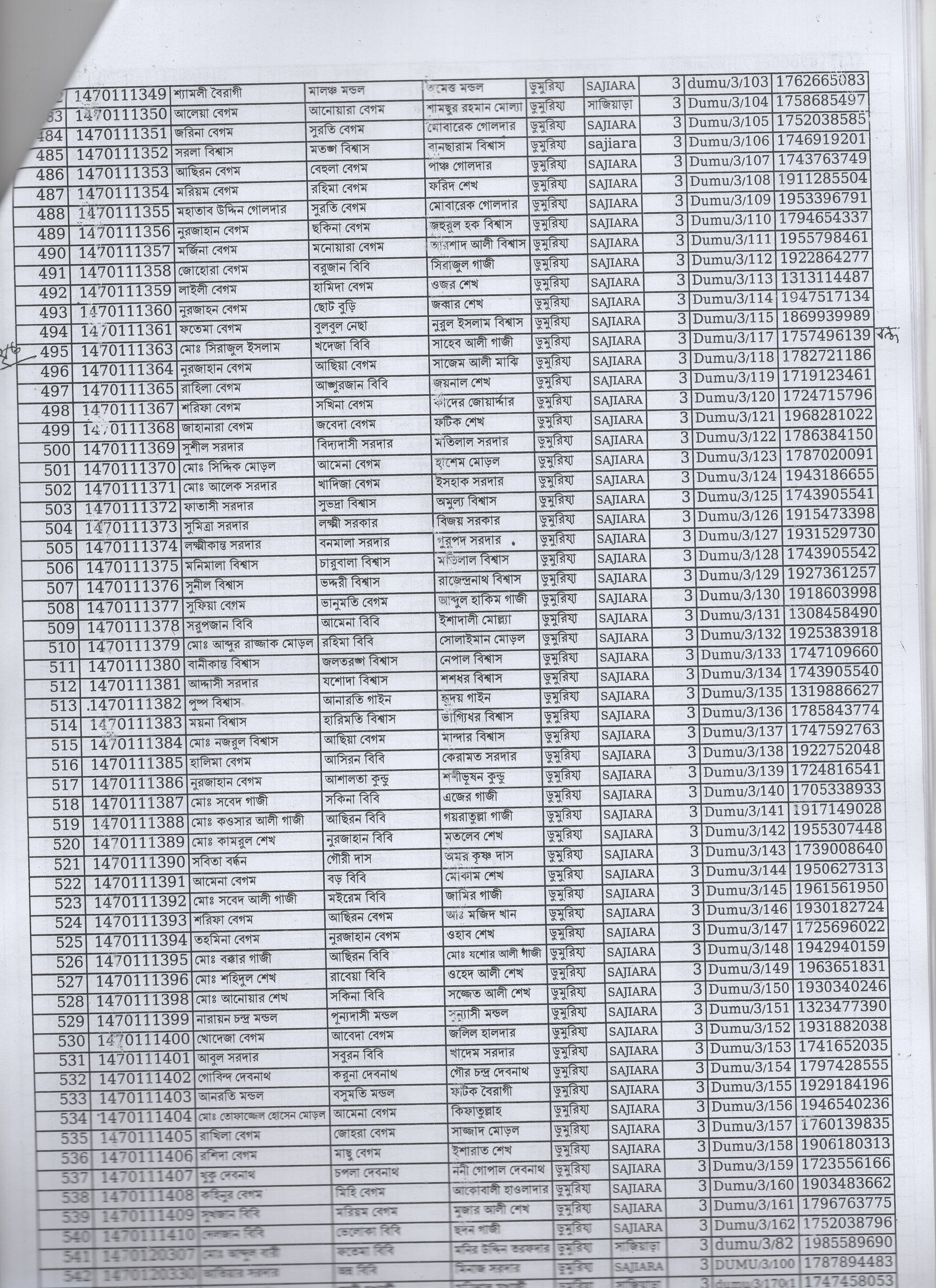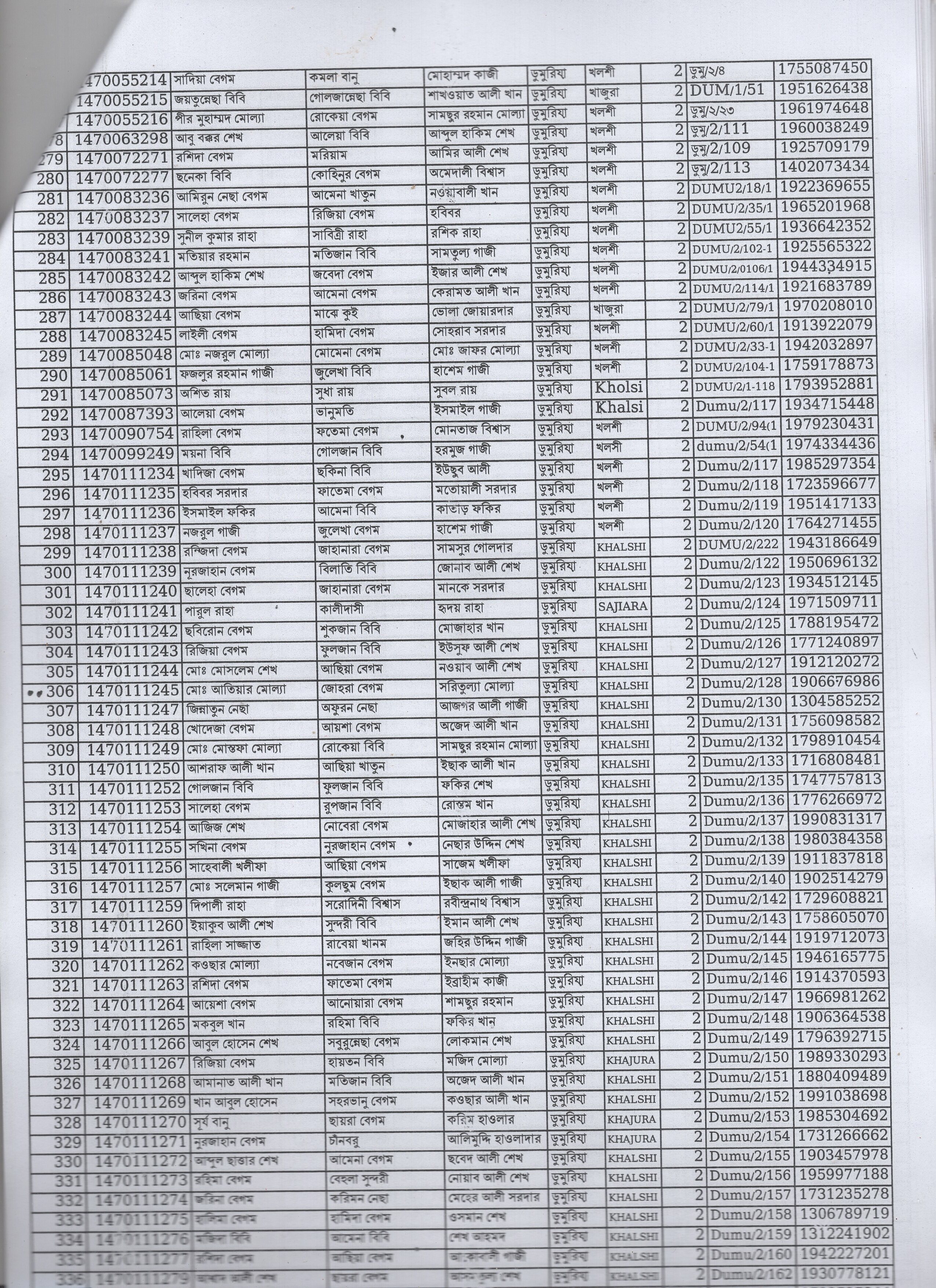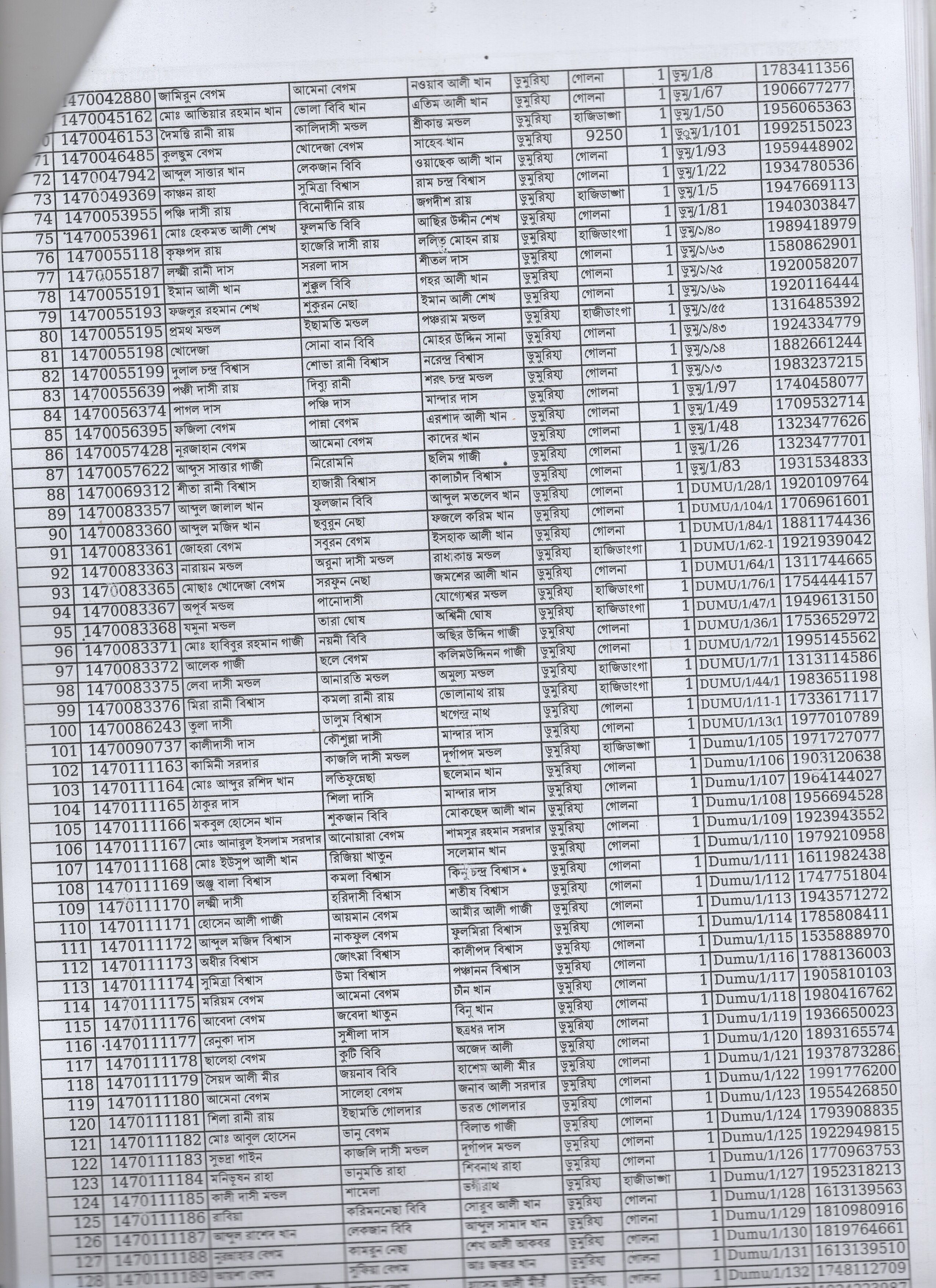 | 44. | ফতেমা বেগম | মৃত আকবার শেখ | দ: ডুমুরিয়া | ৯ | ৩৮৫৪ | ০২২১০৫৯৯৩ |