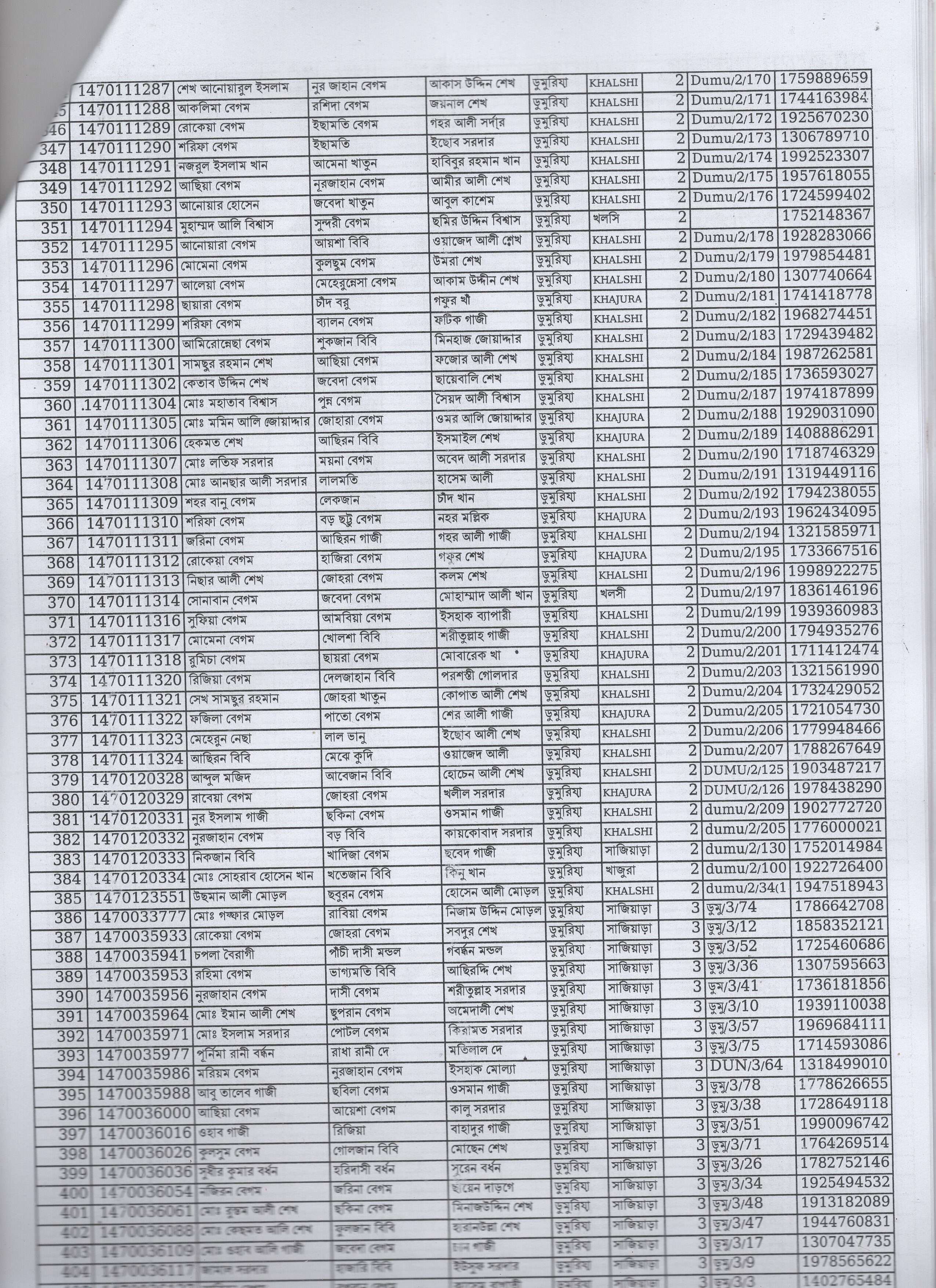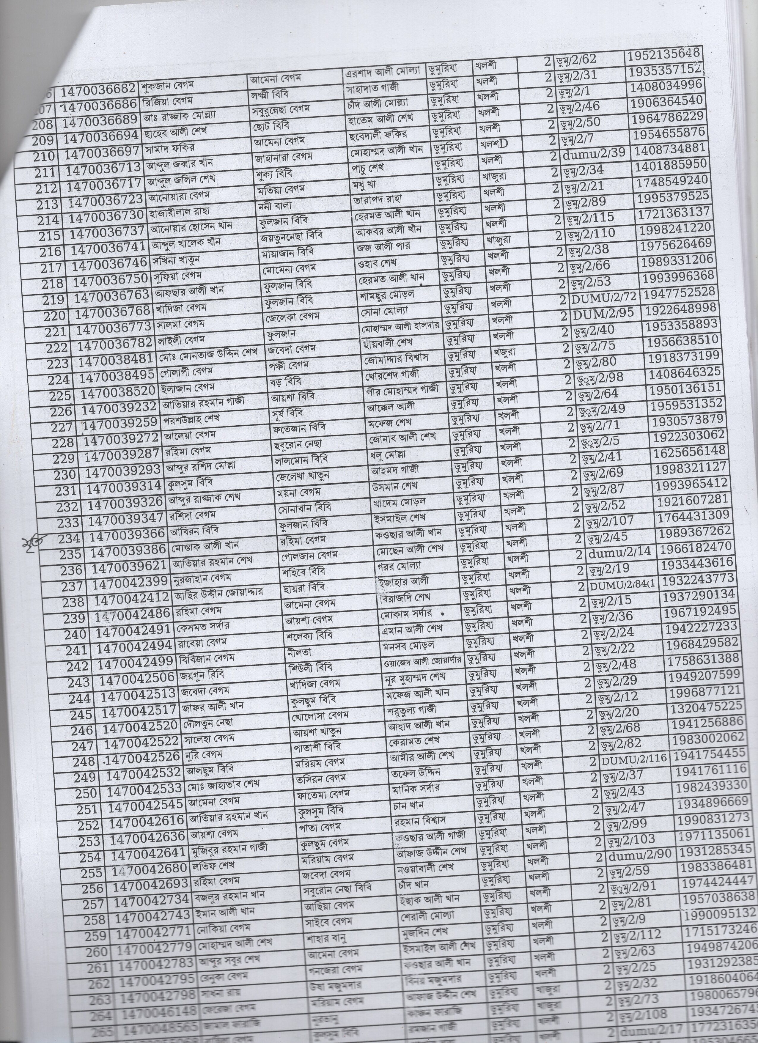 | 49. | হামিদা বেগম | মৃত আমীর ঢালী | দ: ডুমুরিয়া | ৯ | ৪০৪১ | ০২২১০৬০৫৯ |